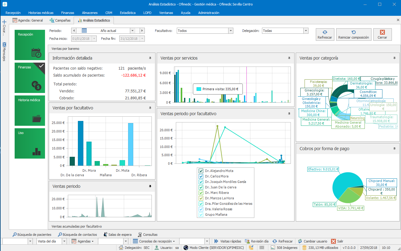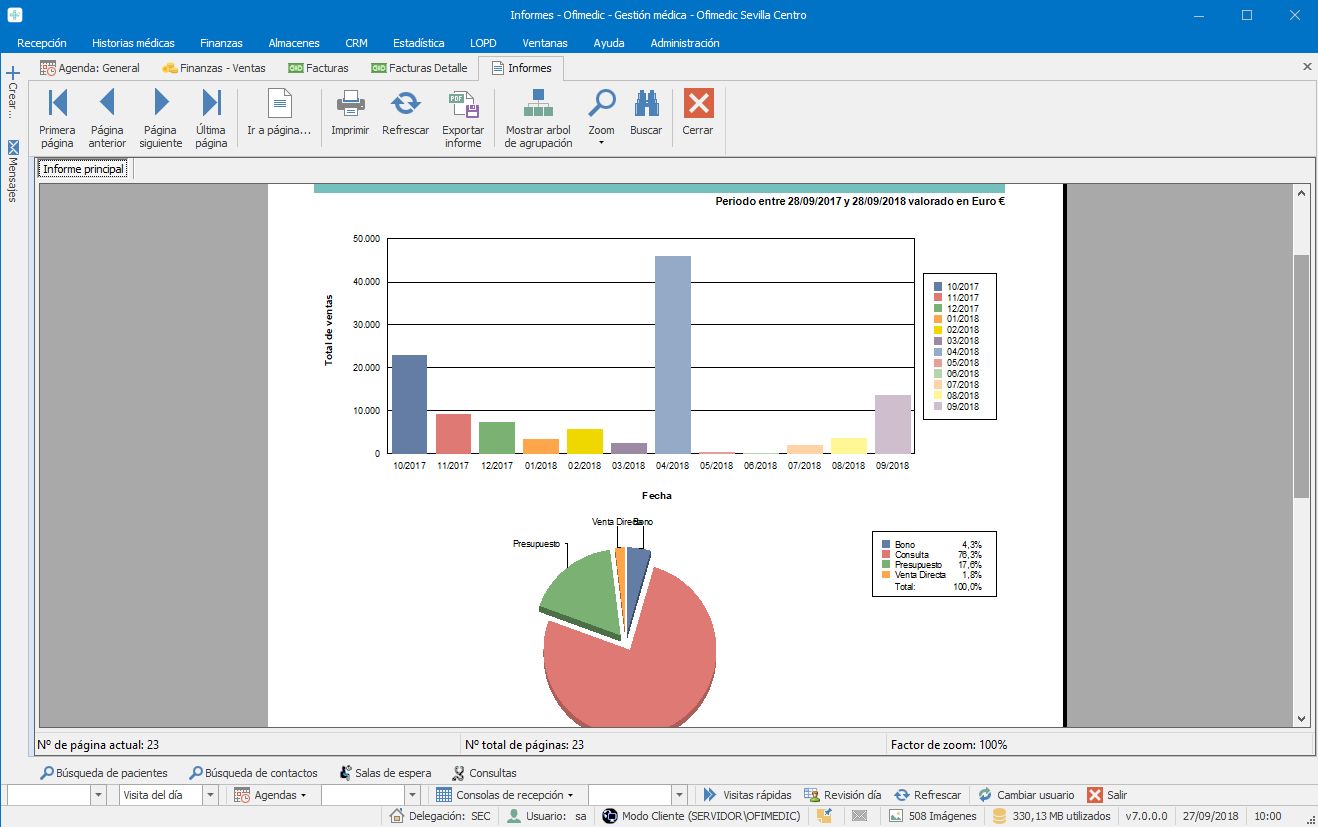 - Informes de actividad: Resumen total de todo lo que ocurre en su consulta en un periodo de tiempo: Altas, visitas, actos médicos, ventas,… todo ello agrupado por conceptos varios, con gráficas, porcentajes...