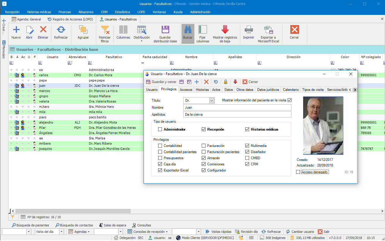- Altas de usuarios con privilegios de acceso: Administradores, historias médicas, recepción, caja total, caja día, ventas, contabilidad pacientes, facturación, historias médicas, CRM, Pedidos...