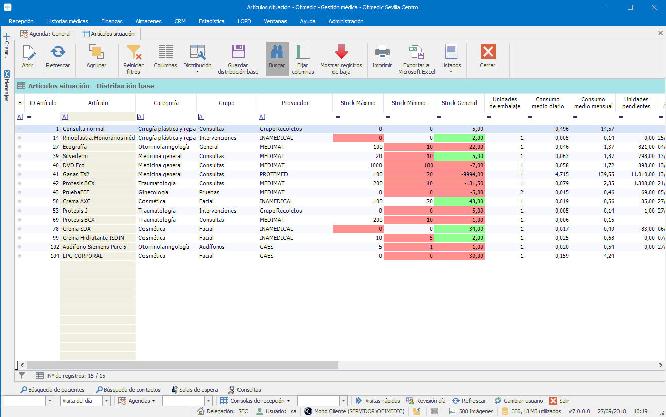 - Stocks máximos, stocks mínimos, artículos bajo mínimos y sobre máximos.